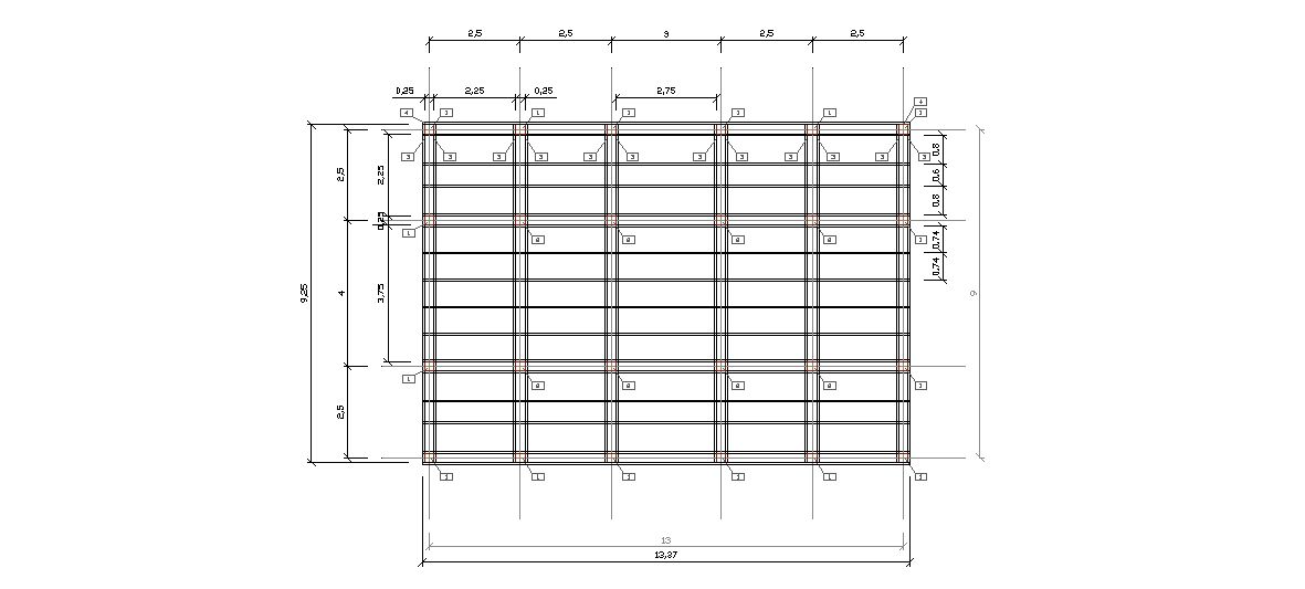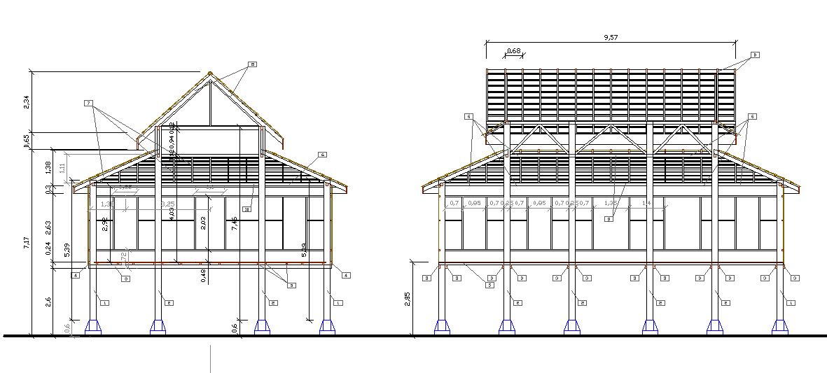 each side, the two central rows of pillars of the house are partially relieved